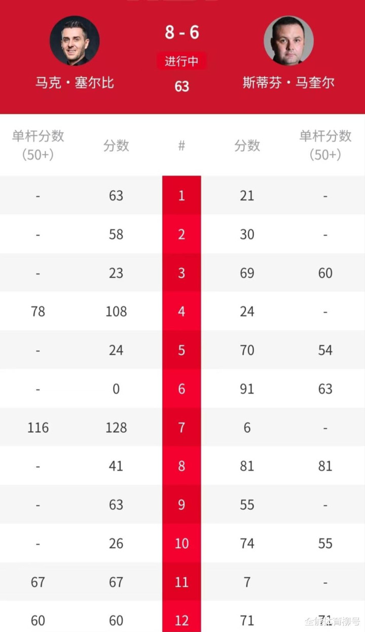 随后两局,塞尔比与布雷切尔两东谈主又是各胜一局,上半场轨则后两东谈主打成2-2平手。休息转头之后,布雷塞尔获得第五局的凯旋,3-2反超比分。
